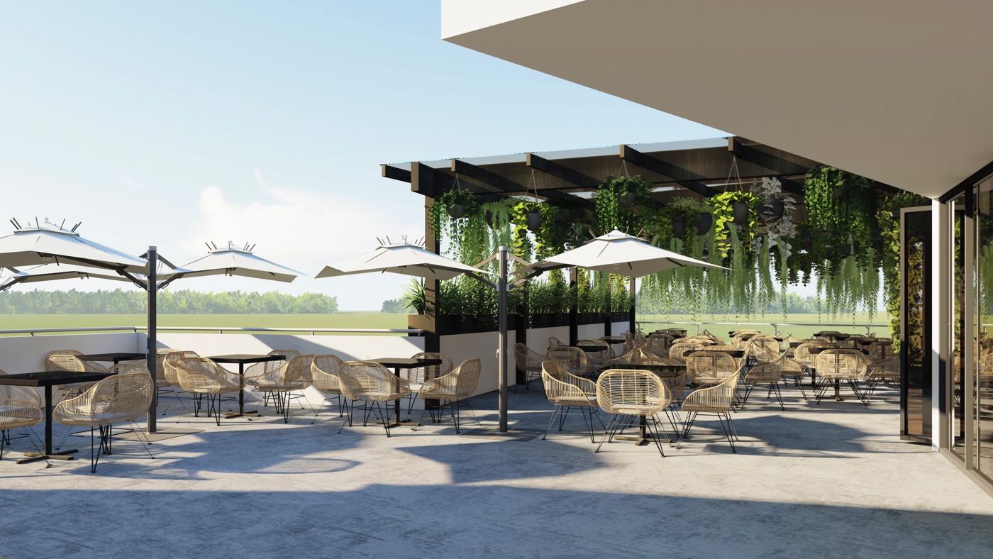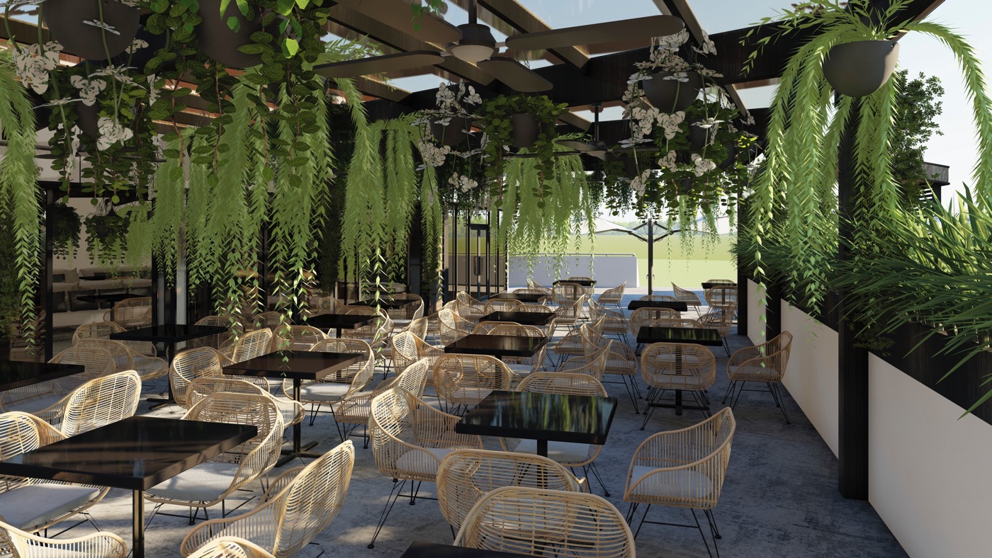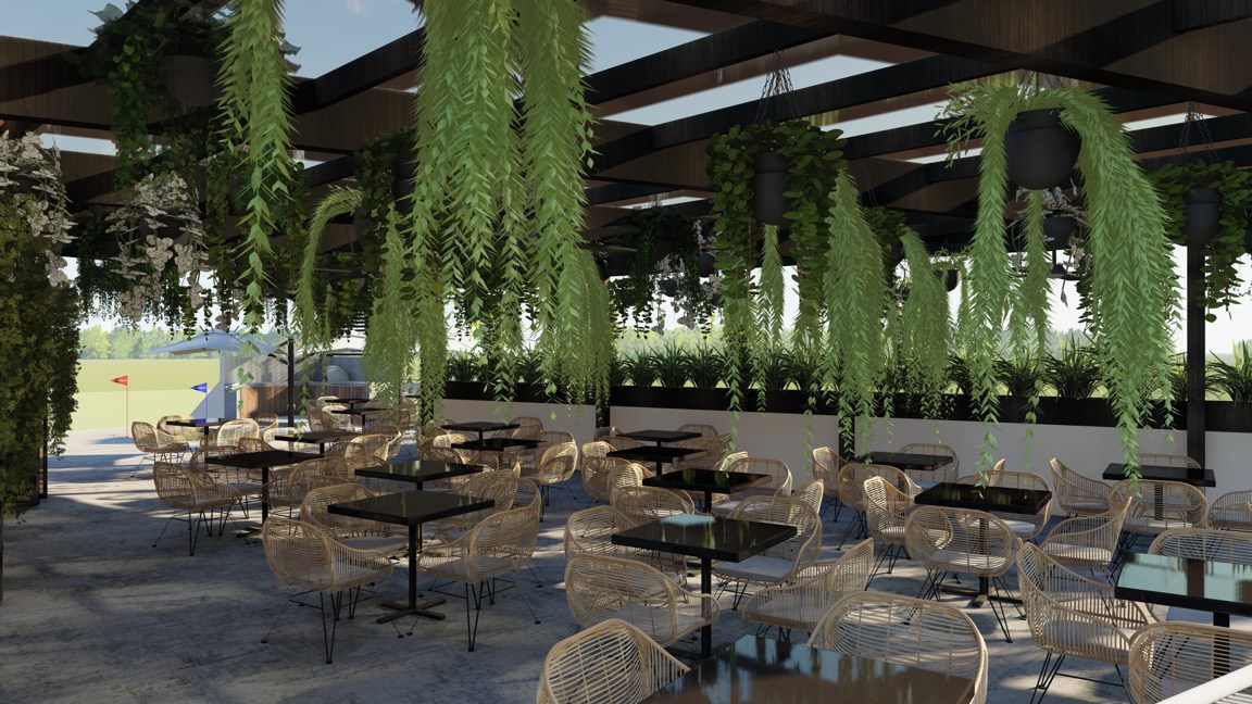 The concept design for a Golf Range and Bar & Grill is a seamless blend of recreational activity and social gathering spaces. Situated amidst a natural landscape as well as lush greenery cascading from the ceiling enhancing its tranquil atmosphere. The layout emphasises an open-plan design, both indoors and outdoors, fostering a free-flowing atmosphere for patrons to enjoy.