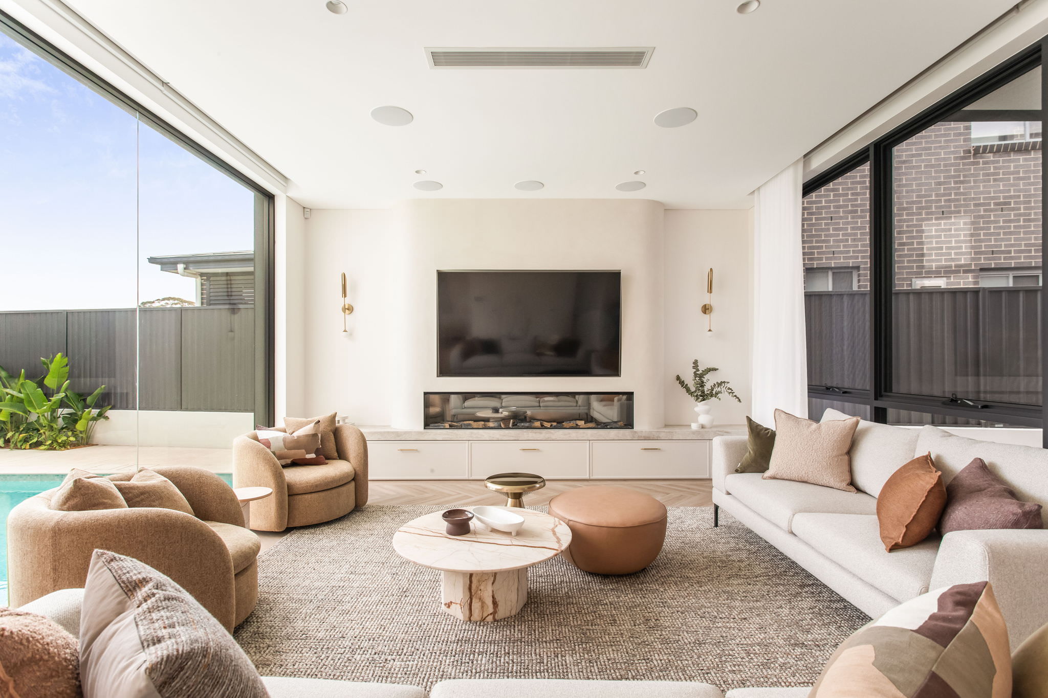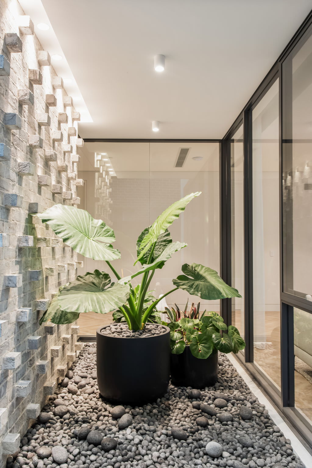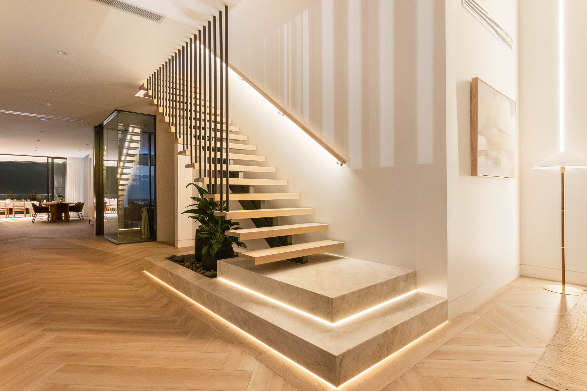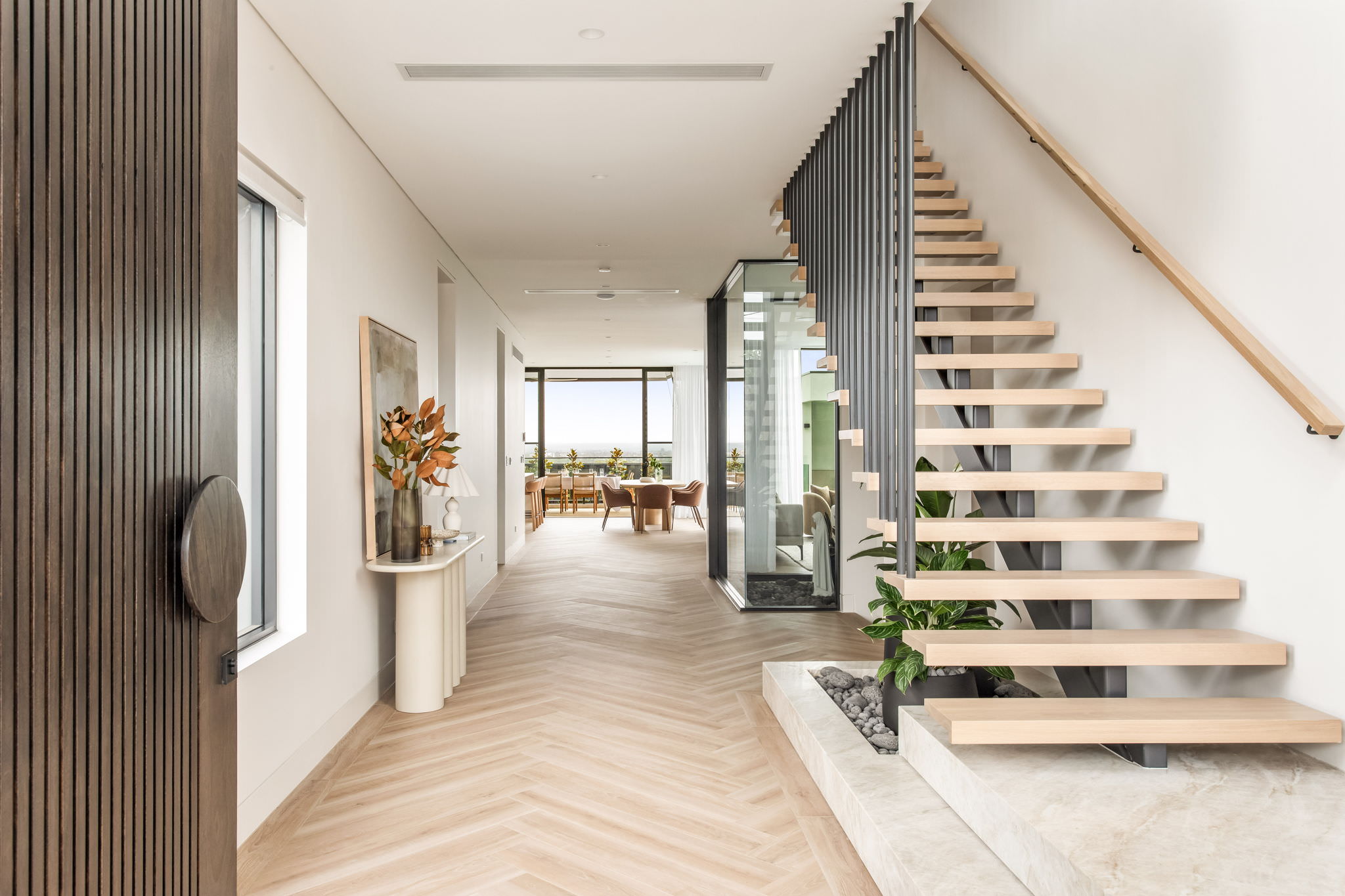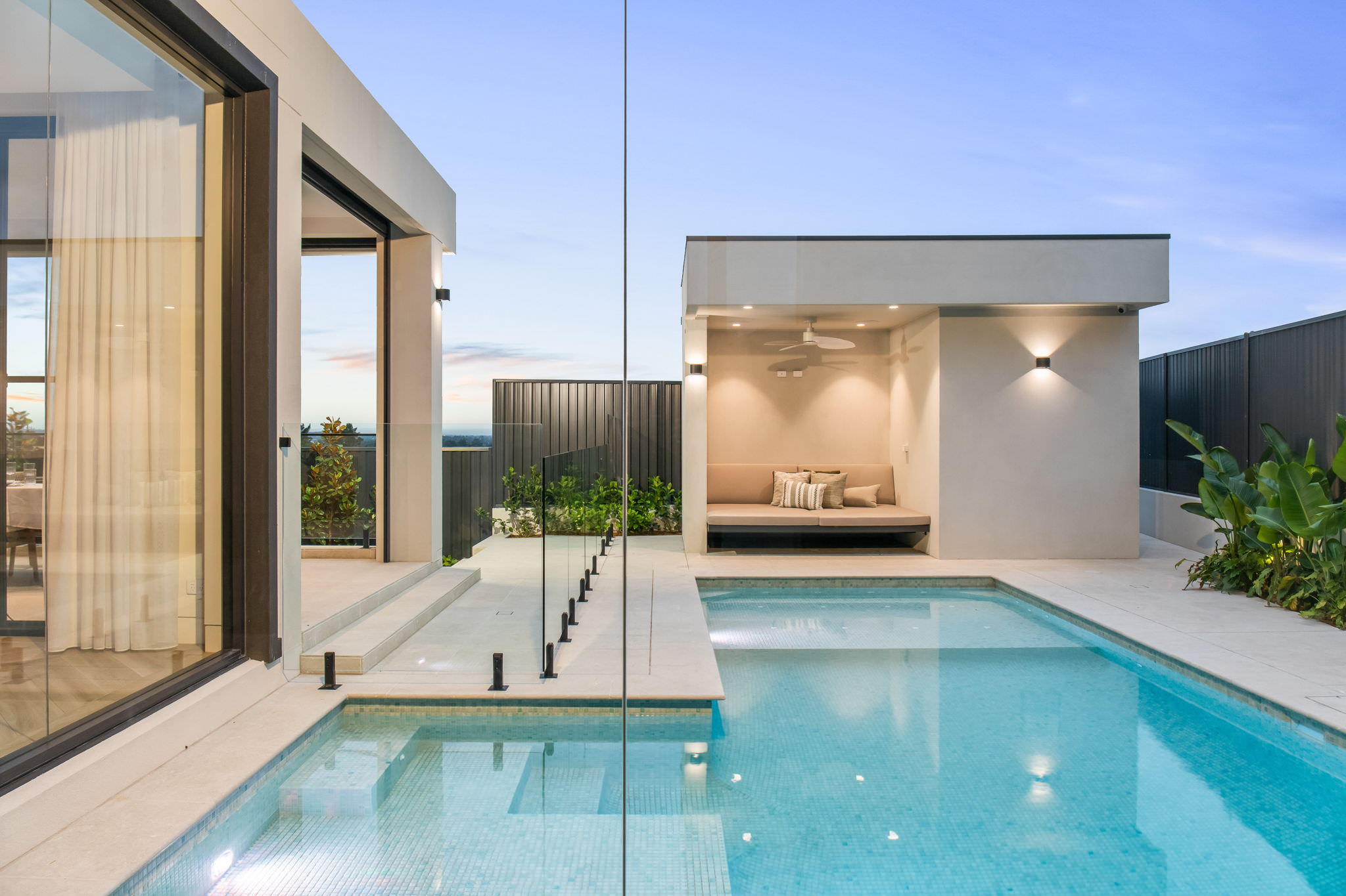 The design harmoniously incorporates an internal courtyard connected to the living area and an interior entry hallway. The backyard boasts a spacious pool area featuring a cabana and an outdoor shower. The master bedroom has been strategically placed at the rear of the property overlooking the natural reserve and is equipped with a spacious ensuite and a generous walk-in robe, while the interior is graced with a sleek floating staircase featuring a double-height feature wall resulting in an elegant and welcoming living environment.