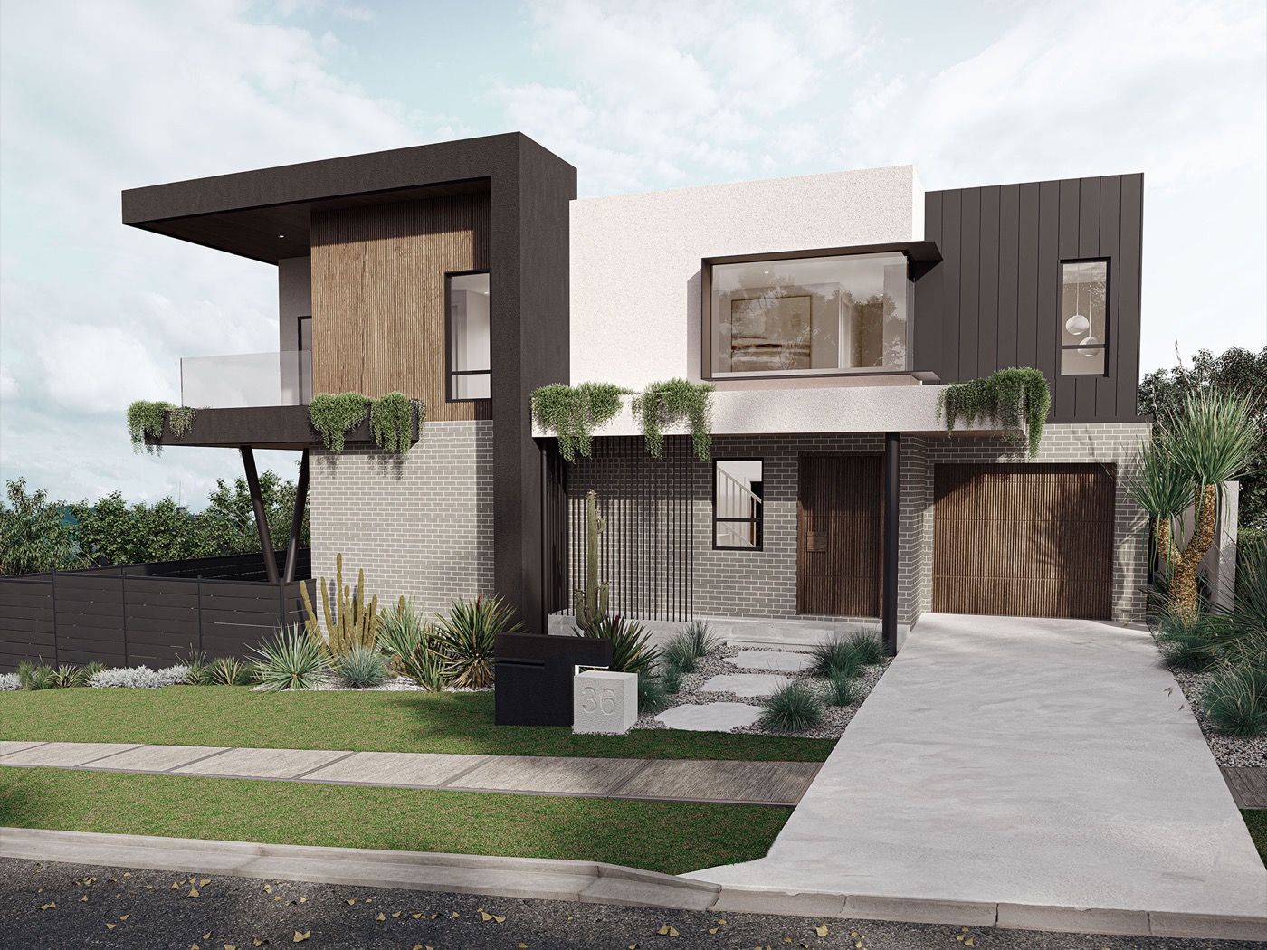 The façade showcases a harmonious blend of industrial elements and contemporary style, with a palette of light grey bricks, soft timber battens, sleek metal sheet cladding accented by steel posts, and corner windows that brings a modern touch. Complemented by polished concrete, white render finish, monument windows and cascading greenery and unique landscaping enhances the overall aesthetic.