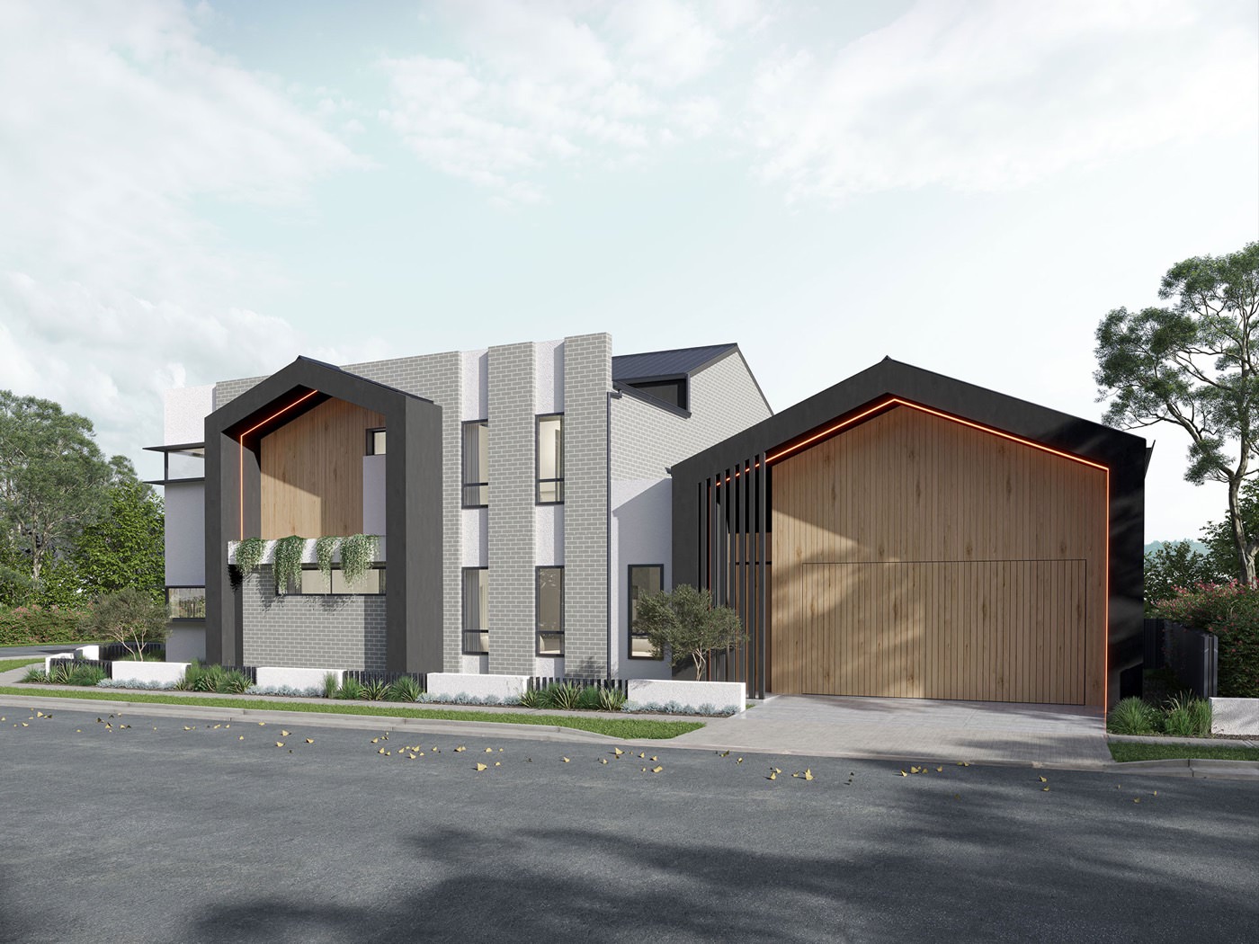 This residence stands out with its minimalist yet captivating form. Notable features include prominent Scandinavian-style gable roofs over the porch, balcony, and garage, accompanied by vertical timber screening. An entry void floods the interior with natural light, while cascading greenery adorns the façade, it complements the woodland landscaping, providing a natural ambiance. Vertical timber battens further enhance the Scandinavian aesthetic, while balconies on the front and side facades provide a striking feature for the corner lot positioning.